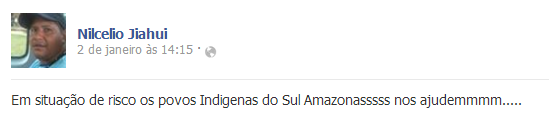 | Post de Nilcelio Jiahui no Facebook clamando por ajuda a seu povo |